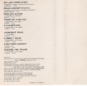 Kappaletiedot painettu etukannen kääntöpuolelle.