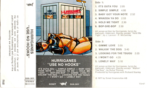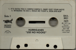 Etiketissä pelkkä TEOSTO ja "kaikki oikeudet pidätetään". Paksu "1" ja HURRIGANES matalalla ja tummalla fontilla. Etiketti erittäin kiiltäväpintainen.