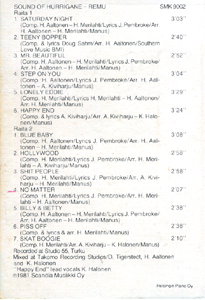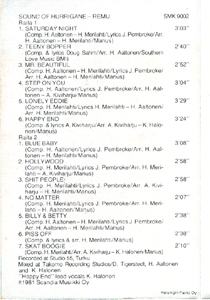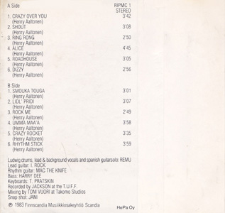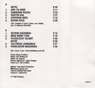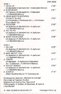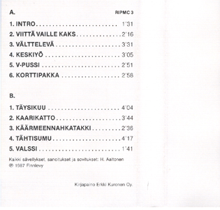 Kappaletiedot painettu etukannen kääntöpuolelle.